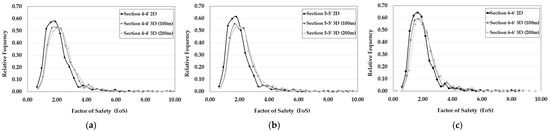 The 3D probabilistic FEM analysis was conducted on the three most critical slip surfaces (cross-section 4-4′, 5-5′, and 6-6′) identified from the overall 3D deterministic LEM analysis. Stability analyses were performed on 100 m and 200 m extruded models for each cross-section to compare FoS results. The 3D probabilistic LEM analysis results are shown in Figure 13; it should be noted that the extruded models represent the actual open-pit mine geometry using heterogeneous block model with three assigned rock types. For the 3D probabilistic LEM analysis, the FoS results of 100 m extrusion model are 1.55, 1.49, and 1.38, and of the 200 m extrusion models, they are 1.62, 1.57, and 1.48 for cross-sections 4-4′, 5-5′, and 6-6′, respectively, as shown in Figure 13a–c and Figure 13d–f.