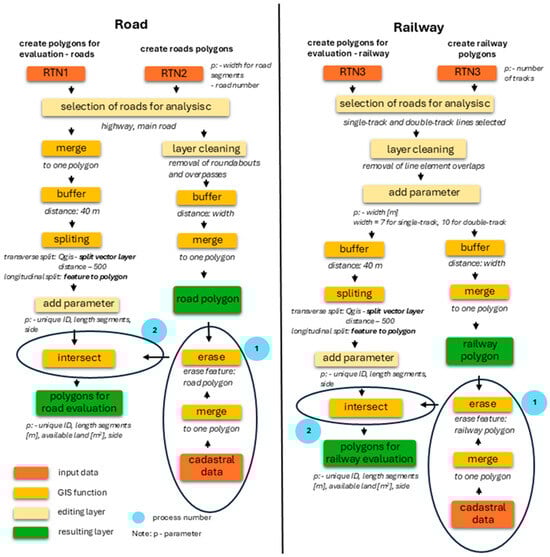 The feasibility of installing water infrastructure was assessed using a newly invented GIS workflow (see Figure 1), employing spatial information about existing road and railway lines in the Czech Republic, as well as the land owned by the state, managed by the Road and Motorway Directorate and the Railway Administration. Since the land for future linear transportation routes is not known in detail, this detailed analysis could only be carried out for existing transport linear structures. The spatial analysis was performed in ArcGIS Pro 3.3.0 and QGIS 3.2.3, using standard GIS operations including buffering, overlay, spatial joins, and difference analysis between cadastral land parcels and transport corridor polygons.