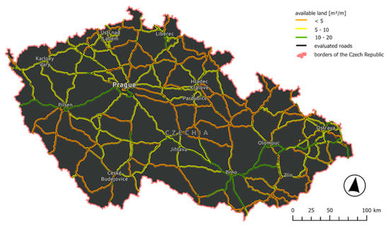 In the next step, the polygons of the evaluated roads were removed from the data layer of land owned by the state with the right to manage the Road and Motorway Directorate and the Railway Administration, in order to obtain information about the area of adjacent land on which the road is not located. It allowed the calculation of the available land in each segment of the road corridor. The final step was to calculate the evaluation ratio, which was the area of available land (m2) per unit length (m) for each segment. The maximum value was set at 40 m2/m, meaning the entire corridor could be used, while the minimum value was 0 m2/m, meaning no available land was present. Based on this calculation, five categories were set for further evaluation (see Table 2). All results are given as discrete values.