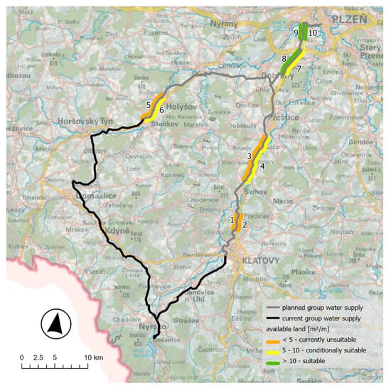 When evaluating the results for the N–P case study (Table 4), we can see relatively good results for half of the evaluated sections (ID—10, 8, 9, 4, 7) with a total length of 21.15 km. However, in the case of sections 10, 9, 8, and 7, there is a duplication of evaluation of the same road section, only from each side separately. The remaining sections on average did not show much availability of state-owned land, and the area will still need to be secured when the drinking water supply pipeline is implemented.