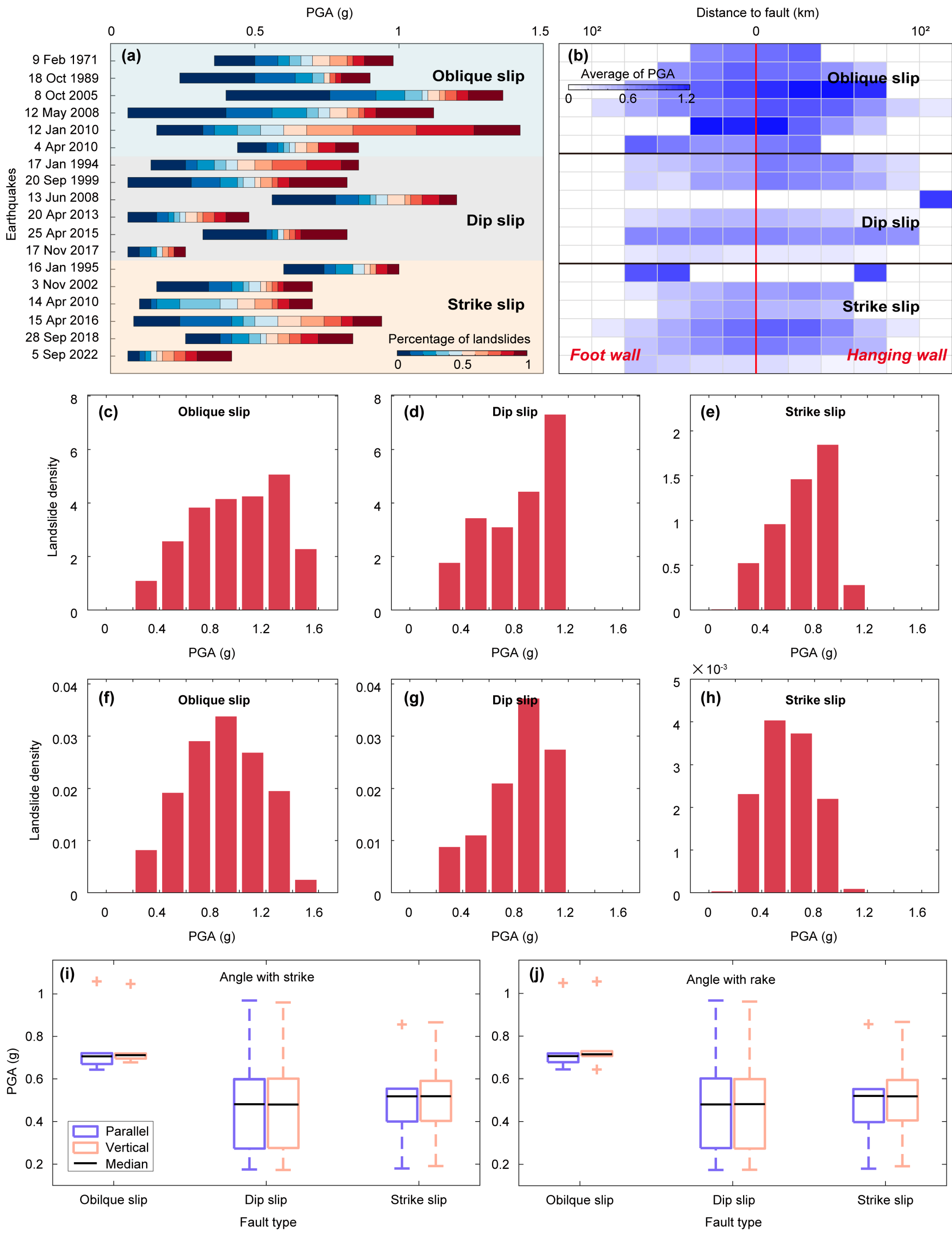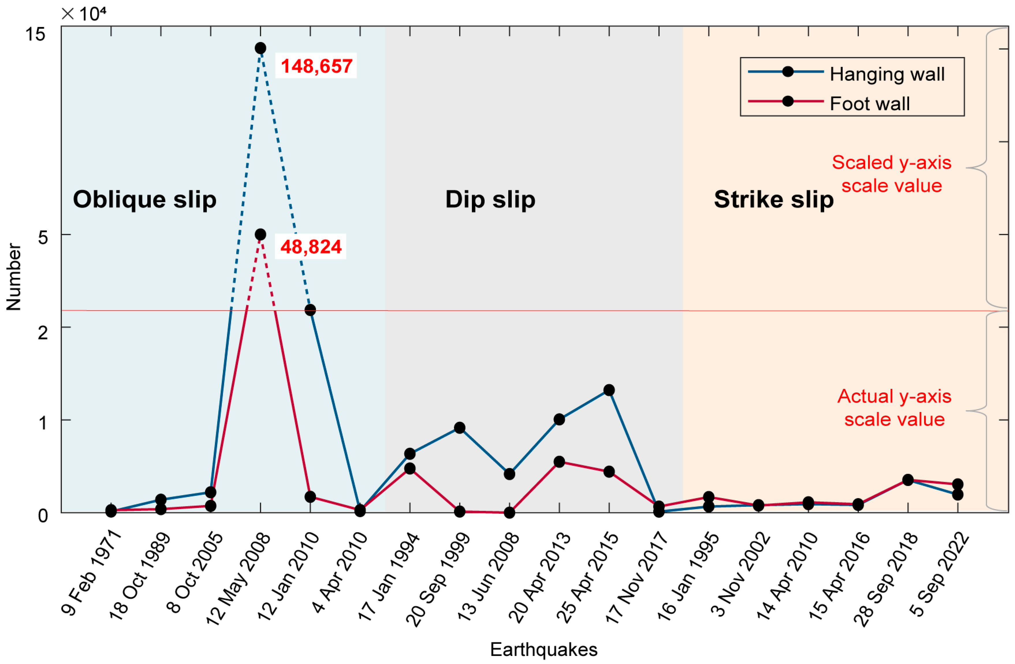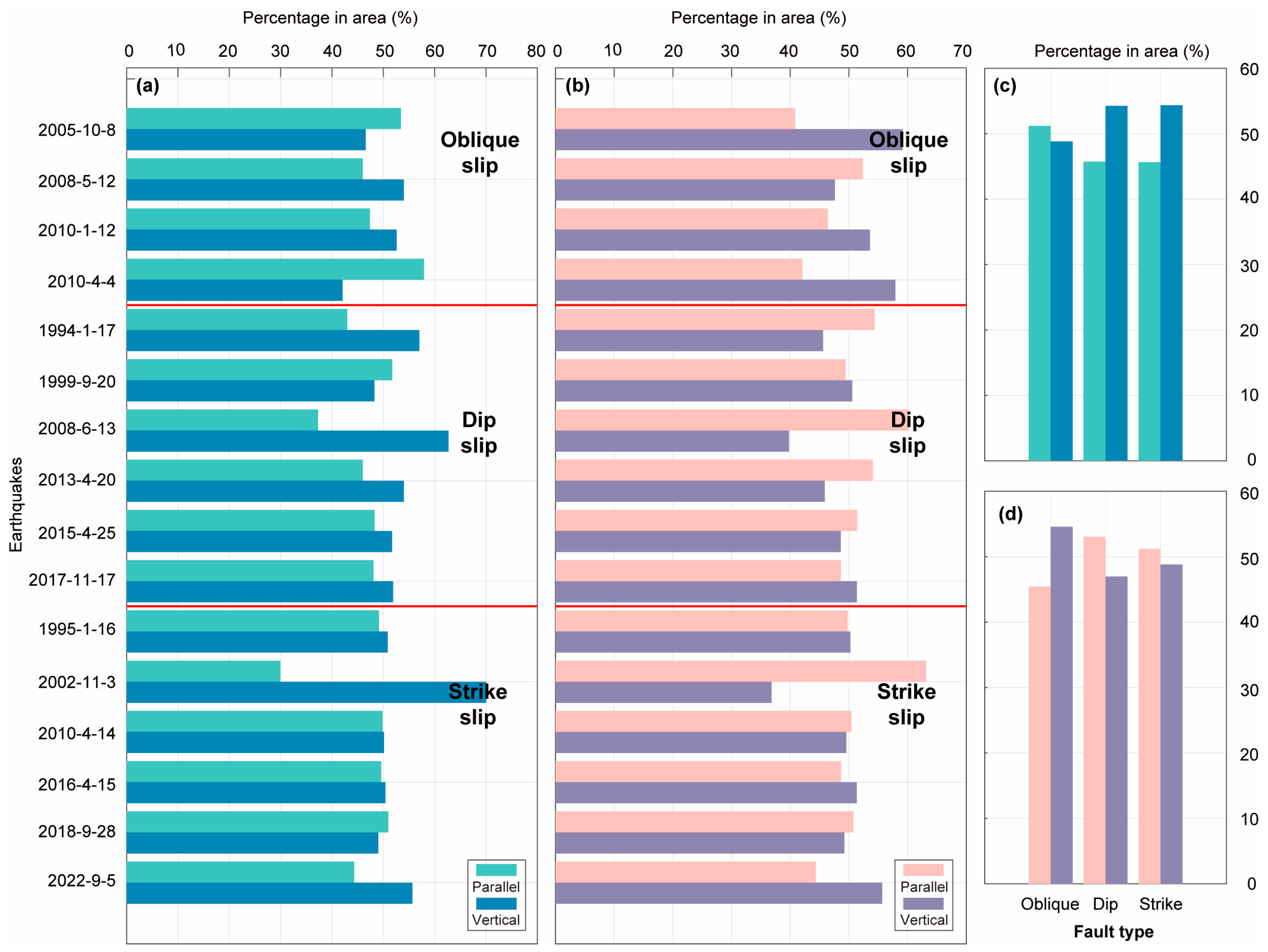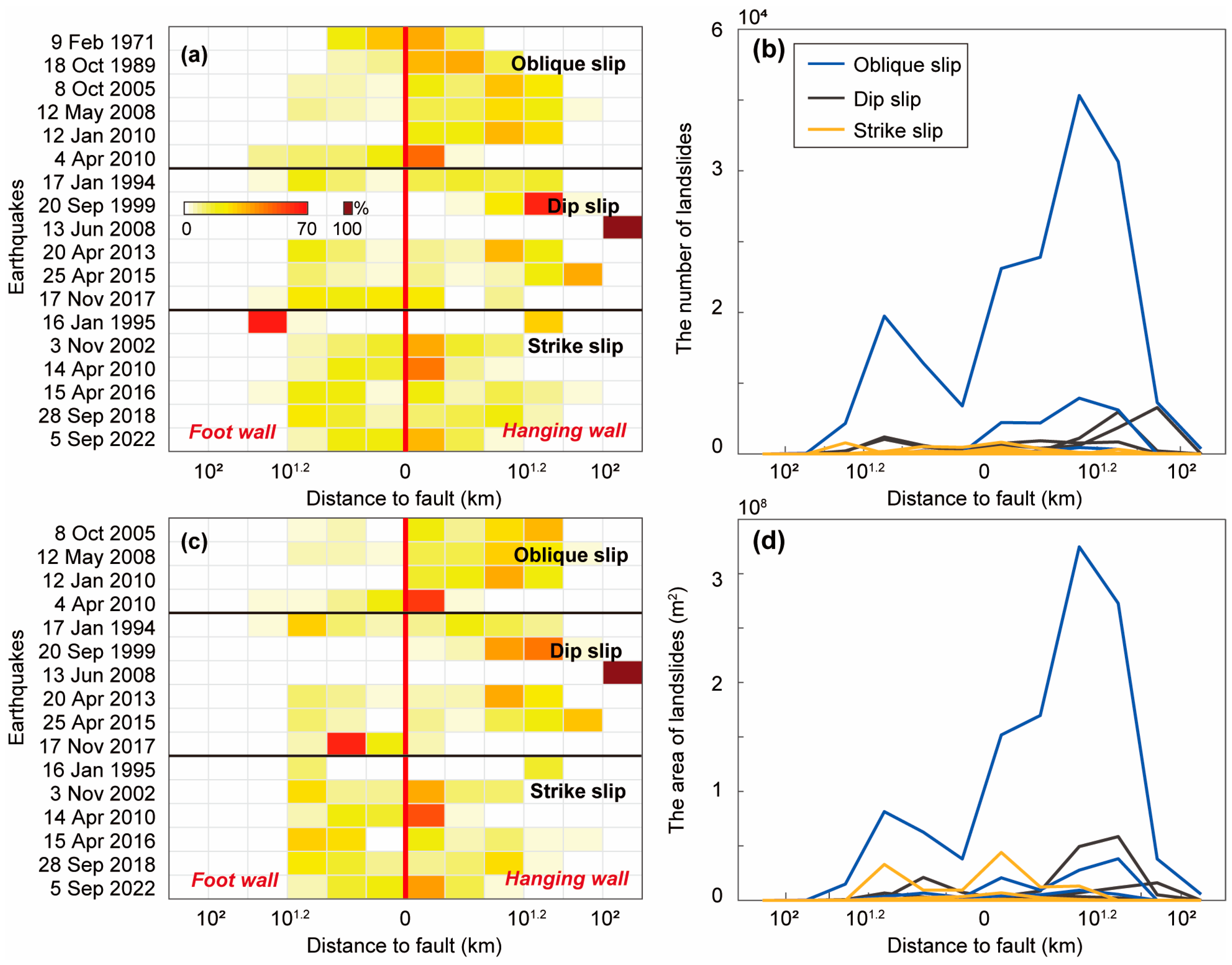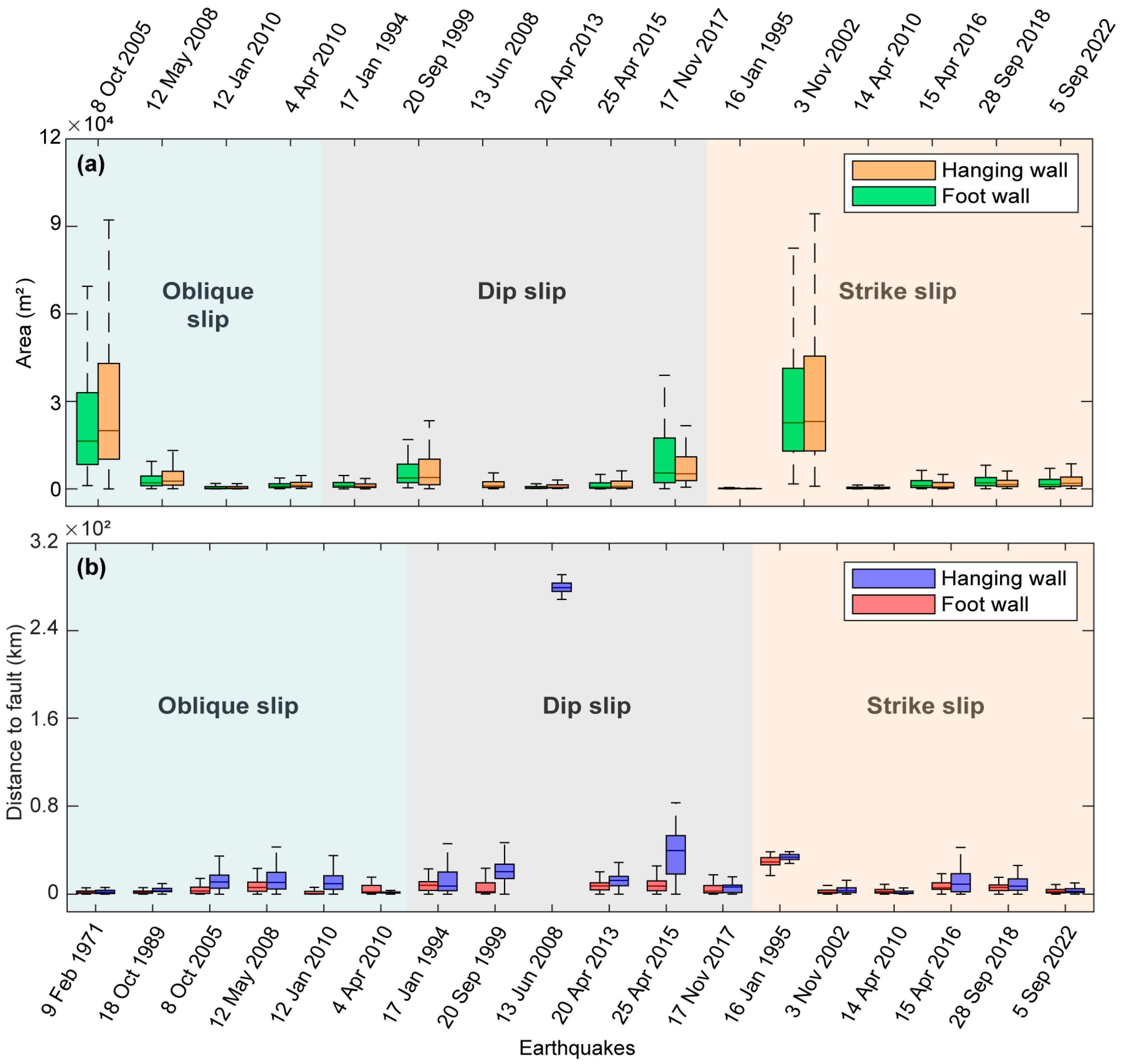 - Landslide area: A clear sequential decrease in the average area of CLs is observed from oblique-slip to dip-slip and then to strike-slip earthquakes. The largest range of landslide areas is associated with oblique-slip faults, suggesting a greater variability in the magnitude of failure. The average area of CLs for oblique-slip faults is approximately 900 m2, which is significantly larger than the average of 500 m2 for dip-slip faults and 300 m2 for strike-slip faults. This indicates that oblique-slip events, which combine both vertical and horizontal motion, are more prone to triggering larger landslides.
