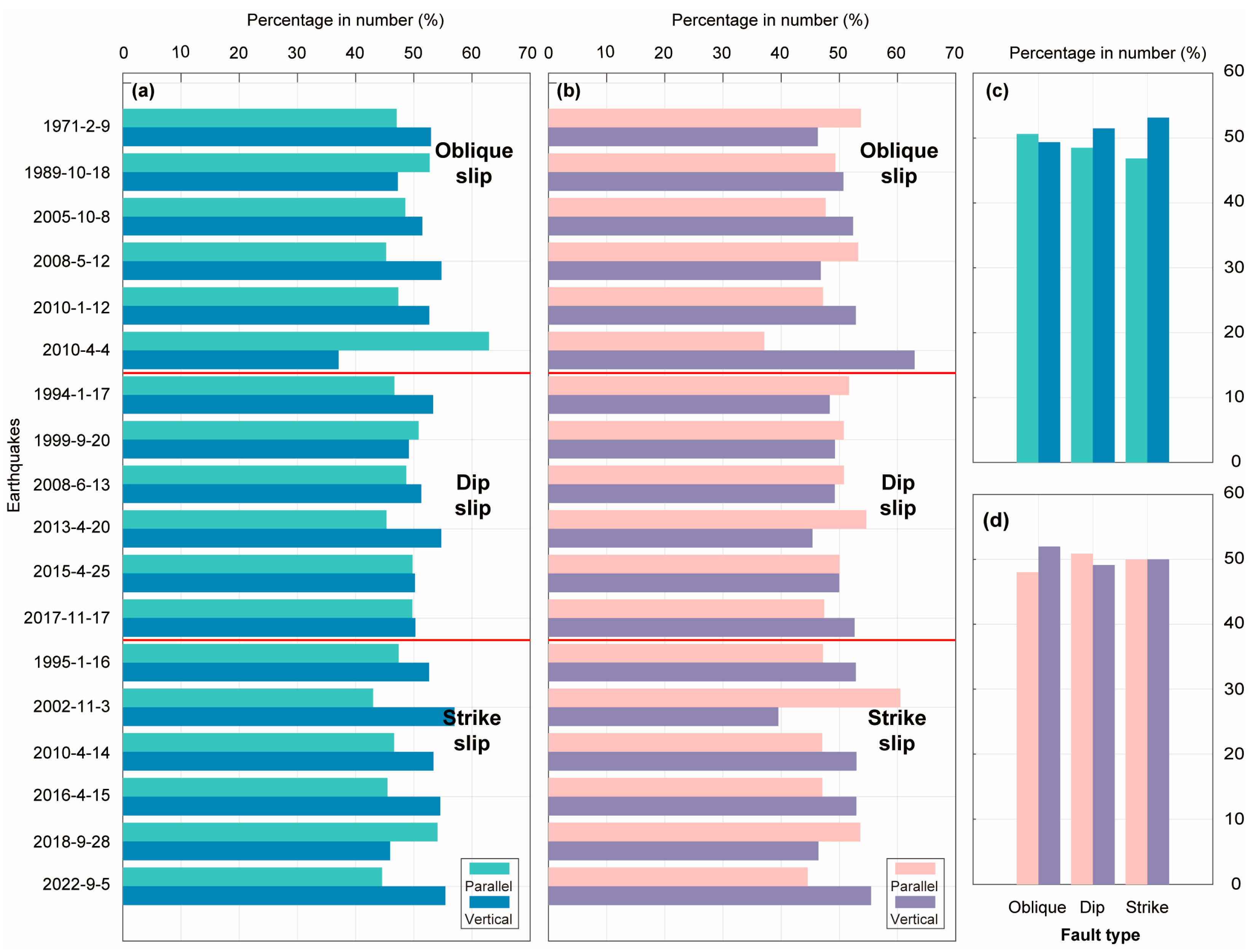 - Rollover point: The average rollover point of the frequency–area distribution curve, which represents the transition from a power-law to an exponential distribution for small landslides, also exhibits a clear pattern linked to fault type. The average rollover value decreases sequentially for oblique-slip, dip-slip, and strike-slip earthquakes, indicating a corresponding increase in the frequency of small-size CLs. The range of rollover value is large in oblique-slip earthquakes (the average is 2331.11 m2), followed by strike-slip (1947.19 m2) and dip-slip (522.56 m2). This suggests that different fault mechanisms may influence the minimum size of a complete landslide inventory. A larger rollover value may imply that a greater number of small landslides are captured in the inventory, potentially due to differences in ground motion characteristics associated with each fault type [74].