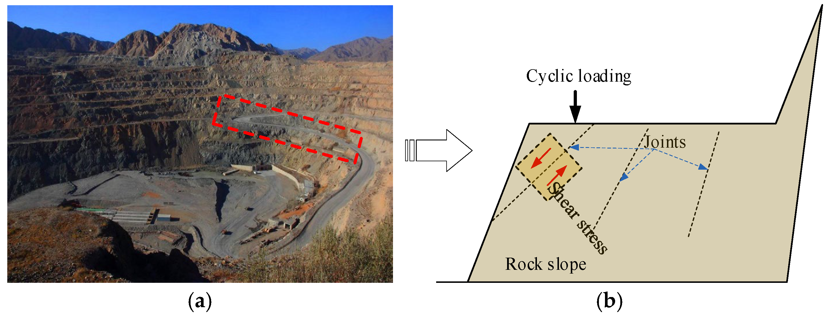 - Fathi, A.; Moradian, Z.; Rivard, P.; Ballivy, G. Shear Mechanism of Rock Joints under Pre-Peak Cyclic Loading Condition. Int. J. Rock Mech. Min. Sci. 2016, 83, 197–210. [Google Scholar] [CrossRef]