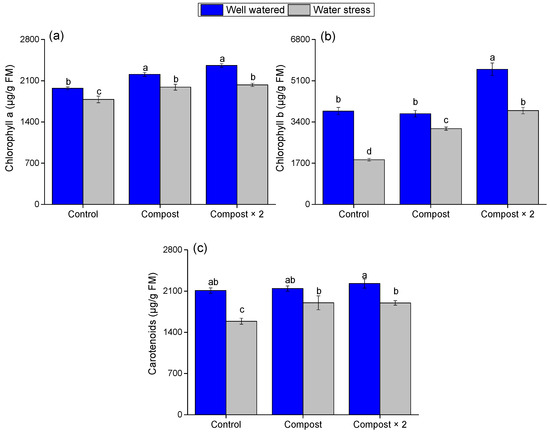 Impact of water stress and compost application on (a) chlorophyll a, (b) chlorophyll b, and (c) carotenoid content in barley leaves. Data are presented as mean ± standard error. Different letters (a, b, ...) indicate significant differences (p < 0.05) based on a post hoc analysis following a two-way ANOVA.