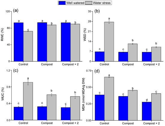 Impact of water stress and compost application on (a–c) water status and (d) MDA content in barley plants. Data are presented as mean ± standard error. Different letters (a, b, ...) indicate significant differences (p < 0.05) based on a post hoc analysis following a two-way ANOVA.