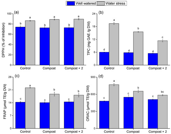 Effect of water stress and compost application on (a) DPPH, (b) TPC, (c) FRAP, and (d) ORAC activity in barley plants. Data are presented as mean ± standard error. Different letters (a, b, ...) indicate significant differences (p < 0.05) based on a post hoc analysis following a two-way ANOVA.