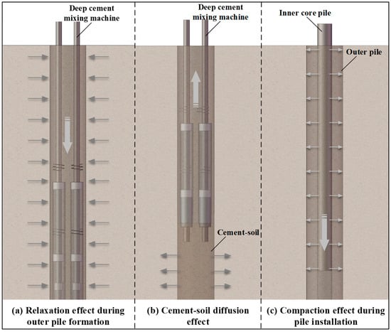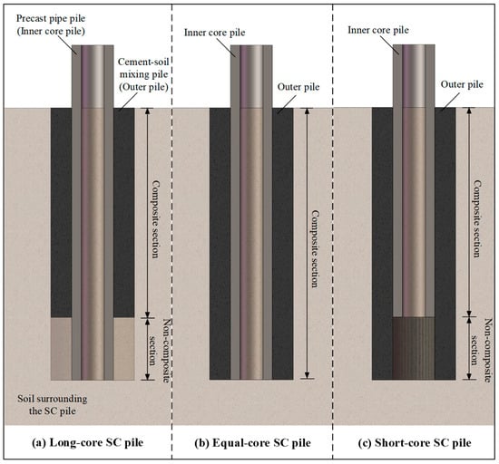 With the rapid expansion of urban construction, excessive settlement and deformation of soft soil foundations have become a critical challenge. Ground improvement techniques such as cement-soil mixing piles and precast concrete pipe piles are widely adopted. However, each method has its own limitations: cement-soil piles are economical and easy to construct but prone to crushing due to low strength [1,2,3], whereas precast piles provide high strength and stiffness but often suffer from inefficient material utilization caused by soil failure [4,5,6]. To address these limitations, the Strength Composite (SC) pile has been developed (also known as the Stiffened Deep Cement Mixing pile in some studies). As illustrated in Figure 1, an SC pile is formed by driving a precast pile into a large-diameter cement-soil mixing pile before hardening, thereby combining the high bearing capacity of precast piles with the significant side friction of cement-soil piles [7]. As shown in Figure 2, based on the relative length of the inner and outer cores, the strength composite piles can be further classified into long-core, equal-core, and short-core types. This hybrid configuration overcomes the limitations of both pile types, offering notable technical and economic advantages. It has been increasingly used in coastal soft soil regions of China [8,9,10,11].
