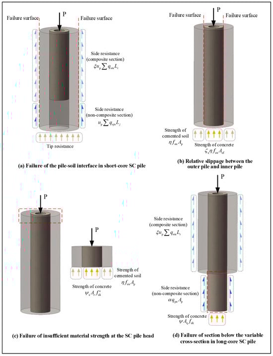 Figure 3. Load-bearing mechanism and failure modes of SC piles. - Failure at the interface between the inner core pile and the outer pile, resulting in relative slippage, as shown in Figure 3b.