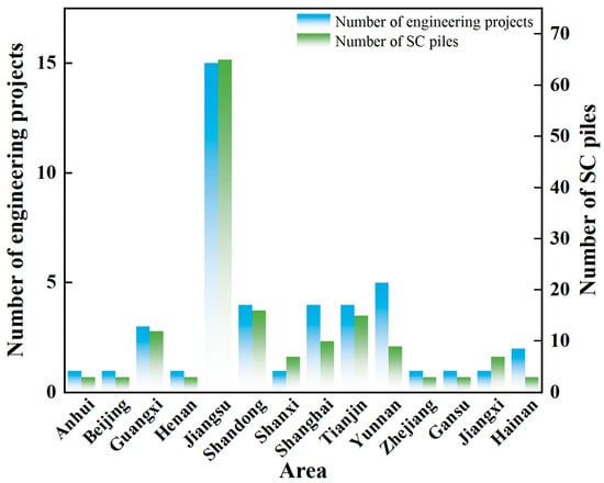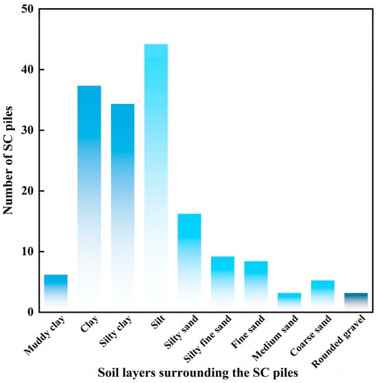 Figure 4 illustrates the regional distribution of the test piles. Among these, Jiangsu Province, characterized by extensive soft soil strata and an urgent demand for high-quality, efficient ground improvement techniques [32], has become the most prevalent region for SC pile applications, accounting for approximately 40.9% of the total cases analyzed.