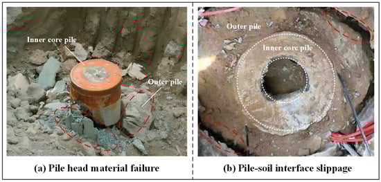 - Insufficient material strength at the SC pile head, leading to crushing near the pile top, as shown in Figure 3c.