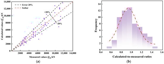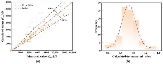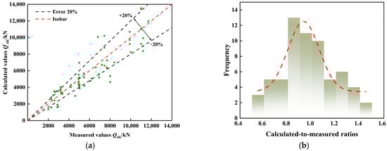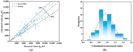 Figure 12 presents the comparison between the bearing capacities calculated adopting the method proposed in this study and the measured values. Figure 12a shows that the vast majority of data points cluster closely around the Isobar, indicating a high degree of agreement between the calculated and measured values. Furthermore, Figure 12b reveals that over 60% of the samples have a calculated-to-measured ratio close to 1.0, and an impressive 82.1% of the samples fall within the ±20% error margin. The ratio distribution exhibits a well-defined normal distribution pattern, concentrated within the 0.8–1.2 range, with very few outliers.