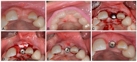 Example of clinical application of a Volume Stable Collagen Matrix. (A) Edentulous space requiring implant-prosthetic rehabilitation, (B) surgical template for implant positioning, (C) implant placed in the correct prosthetic position, (D) VCMX placement on the buccal aspect, (E) suture placement and (F) one-month post-surgical follow-up.