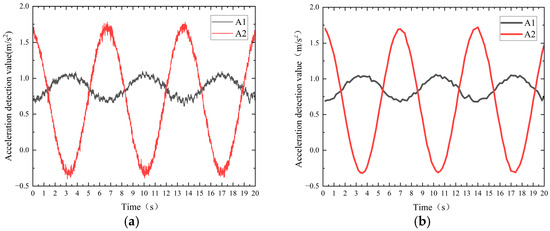 Data were collected from 02:00 to 03:00 on 7 January 2024, including parameters such as acceleration, temperature, and load. The accelerometer sensors had a sampling frequency of 100 Hz, yielding 360,268 data points; the temperature sensors sampled at 1 Hz, providing 3603 data points; and the load sensors operated at 50 Hz, resulting in 180,134 data points. This 1 h dataset, recorded during a period of stable wind turbine operation, provides a substantial number of data points for analysis and serves as a representative case study to demonstrate the principle and sensitivity of our method. The proposed algorithm is designed for continuous monitoring and can be applied to data streams of any duration. The sensors are distributed and arranged at various locations. For clarity in the following discussions, corresponding labels are provided to denote the difference parameters, as illustrated in Table 1. Initially, the sampling frequencies of the monitoring data are synchronized to yield datasets with uniform sample sizes. The specific methods employed are as follows: the acceleration data are averaged every 20 data points, the load data every 10 data points, and the temperature data are interpolated using the Piecewise Cubic Hermite Interpolating Polynomial (PCHIP) [22] method, recording five data points per second. This approach effectively retains the essential characteristics of the data and avoids excessive simplification that could lead to information loss, which minimizes the errors introduced by interpolation. Taking the data from the acceleration sensor as a case study, Figure 1 illustrates the curves before and after the time synchronization process.