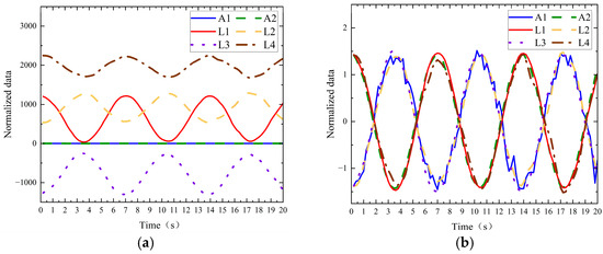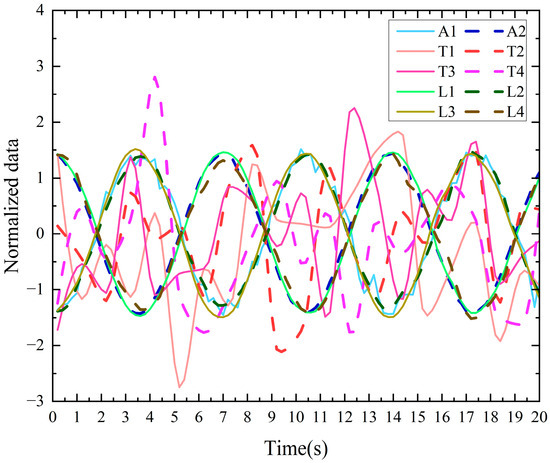 Figure 4 illustrates the acceleration, temperature, and load data curves for a wind turbine blade operating under normal conditions over a 20 s interval. It is evident that the fluctuation ranges of the acceleration and load curves are approximately −1.5 to 1.5, indicating that the original data fluctuations for both acceleration and load are roughly 1.5 times the standard deviation. The curves display periodic fluctuations with a period of approximately 7 s and stable amplitudes. The temperature amplitudes change between −3 and 3 with a characterization of significant fluctuations and a lack of obvious periodic variations, which suggests an absence of clear regularity. The normalized curves of A1, L2, and L3 nearly overlap, which can also be found for the curves of A2, L1, and L4. Notably, the phase of the normalized curves for A1, L2, and L3 differs by 180° relative to A2, L1, and L4. This indicates a significant correlation among A1, A2, L1, L2, L3, and L4, which somewhat results from the installation positions of the sensors. Two fiber optic acceleration sensors are positioned at one-third of the blade length on both sides of the blade, while four fiber optic load sensors are located at the blade root, evenly distributed along the circumference with an angular separation of 90° between adjacent sensors. This configuration forms a bridge measurement array to assess the load on the blade, resulting in a phase difference in the sensor monitoring data curves.