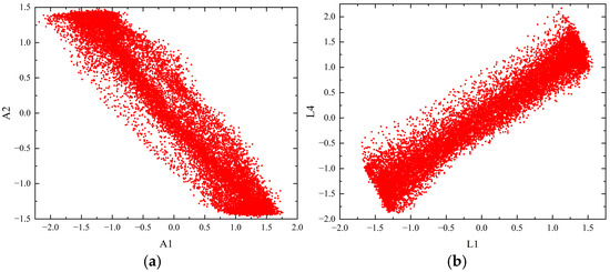 The prerequisite for employing Pearson correlation is the assumption of a linear relationship between variables. Prior to analysis, the linearity of the relationship between key parameters was preliminarily assessed through visual inspection of scatter plots. In this work, we analyze the accelerometer data and the load data as an example. The scatter distribution of 18,000 data points for A1 and A2, L1 and L4 is presented in Figure 3. The results confirmed a strong linear trend in the normalized data under normal operating conditions. Although wind turbine systems can exhibit nonlinear behaviors under faulty or extreme conditions, the primary focus of this study is on validity assessment under normal operation, where linear assumptions hold.