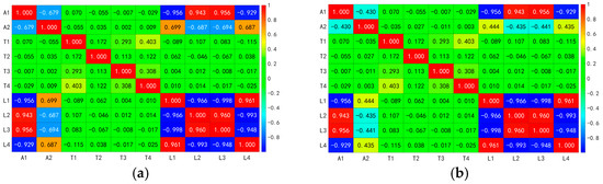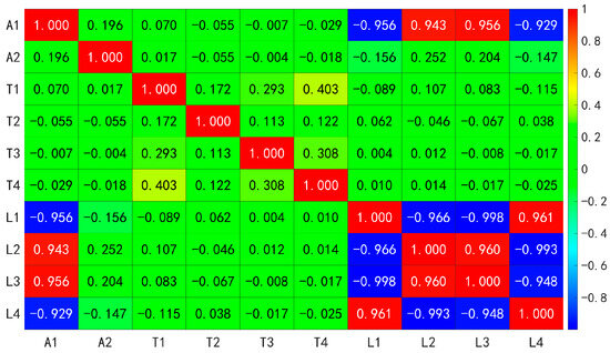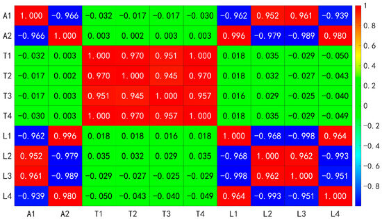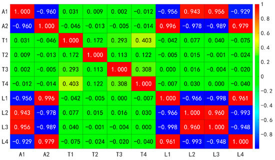Figure 5 illustrates a heatmap of Pearson correlation coefficients among various parameters monitored over a 1 h period. Notably, positive linear correlations exist between A1 and L2, A1 and L3, A2 and L1, A2 and L4, L1 and L4, and L2 and L3, with correlation coefficients ranging from 0.943 to 0.996. This suggests that the fluctuation trends of these variables are nearly synchronized. When one variable increases, the others tend to increase as well, and conversely, when one variable decreases, the others tend to decrease. Additionally, significant negative linear correlations are observed between A1 and A2, A1 and L1, A1 and L4, A2 and L2, A2 and L3, L1 and L2, L1 and L3, L2 and L4, and L3 and L4, with correlation coefficients ranging from −0.929 to −0.998. This indicates that the fluctuation trends of these variables are largely oppositional. These findings are entirely consistent with the results in Figure 4. Given the strong correlations among the parameters, any abnormal value in a specific parameter will alter the correlation with other parameters. Thus, the validity of the data can be assessed based on the degree of association between the parameters. However, the correlation coefficients between T1, T2, T3, T4, and the other parameters range from −0.115 to 0.403, which indicates no significant correlation. Consequently, their validity cannot be determined based on the degree of association.
