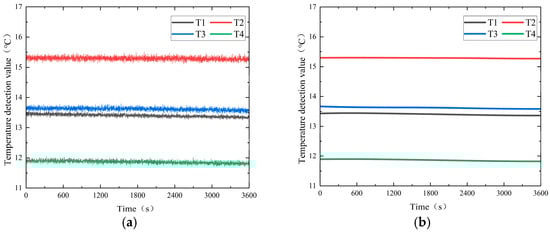 Here, we process the data signal by a Butterworth low-pass filter [26] to reduce the effect of noise on the correlation coefficient. Figure 6 shows the temperature data curve with and without filtering. It is evident that the temperature curve prior to filtering displays significant high-frequency noise. After applying the filter, the curve becomes smooth, the high-frequency noise is eliminated, and the overall trend of the curve is clarified.