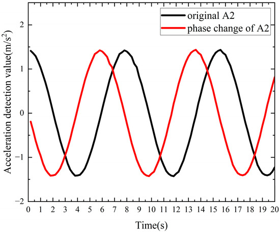 Here, A2 data of the wind turbine during normal operation are phase-shifted by 90°. The comparison between the original A2 data and the phase-shifted data is shown in Figure 8. The phase-shifted data are integrated with other normal data to create a comprehensive dataset. The corresponding Pearson correlation coefficient heatmap is calculated, as shown in Figure 9. It can be found that the peaks, troughs, and overall shape of the A2 data curve exhibited minimal changes, indicating that the amplitude of the data remained constant. However, Figure 9 reveals that the absolute values of the correlation coefficients between A2 and A1, L1, L2, L3, and L4 shift from a strong correlation range of 0.960 to 0.996 to a weak correlation range of 0.147 to 0.252. This indicates that the A2 data became unreliable, which contradicts the actual results. Consequently, it is imperative to adjust the phase of periodic data prior to conducting correlation analysis to avoid misjudgments.