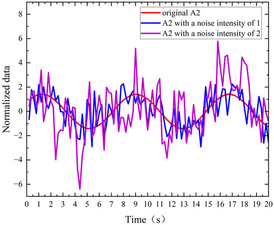 In many natural phenomena and signal processing applications, the most frequently encountered noise is a Gaussian distribution, commonly referred to as Gaussian noise [29,30,31]. During the normal operation of the wind turbine, Gaussian noises with intensity levels 1 and 2 are introduced into the A2 monitoring data. The comparison curves between the original data and the data affected by Gaussian noise are presented in Figure 10. The noise data are integrated with other normal data to form a comprehensive dataset, and the corresponding Pearson correlation coefficient heatmap is calculated, as shown in Figure 11. When the A2 data were subjected to Gaussian noise of intensity 1, the absolute values of the correlation coefficient between A2 and other parameters decrease from 0.960–0.996 to 0.679–0.699, representing a reduction of approximately 29.55%. When the A2 data are disturbed by Gaussian noise of intensity 2, the absolute value of the correlation coefficient between A2 and other originally strongly correlated parameters decreased from 0.960–0.996 to 0.430–0.444, indicating a reduction of approximately 55.32%. This suggests that as the noise intensity increases, the degree of correlation between A2 and other parameters diminishes progressively. It can be concluded that the introduction of higher intensity Gaussian noise renders the A2 data unreliable.