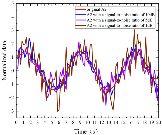 During the normal operation of the wind turbine, Gaussian white noise with signal-to-noise ratios (SNR) of 10 dB, 5 dB, and 1 dB was introduced into the A2 monitoring data. Figure 12 illustrates the comparison of the curves between the original data and the noise-interfered data. Subsequently, the noisy data are combined with other normal data to create a comprehensive dataset, from which the corresponding Pearson correlation coefficient heatmap is generated, as shown in Figure 13. For a signal-to-noise ratio of 10 dB, the absolute values of the correlation coefficients between A2 and A1, L1, L2, L3, and L4 decreased to 0.917–0.951, reflecting a reduction of approximately 4.48%. For 5 dB, these coefficients further decreased to 0.838–0.870, indicating a reduction of around 12.71%. For 1 dB, the absolute values dropped to 0.718–0.747, representing a reduction of approximately 25.21%. These data suggest that as the signal-to-noise ratio decreases, the real signal data are increasingly affected by noise, leading to a weakening of the correlation between signal data and a decline in data reliability. In other words, a lower signal-to-noise ratio corresponds to a greater interference of white noise on the signal; conversely, a higher signal-to-noise ratio enhances the ability to resist white noise interference, thereby facilitating more accurate signal identification.