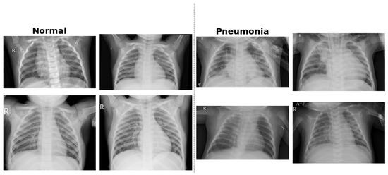 The dataset is organized into three predefined folders: training, validation, and testing. These subsets are balanced across the two classes, facilitating supervised learning and consistent performance evaluation. The images are in JPEG format and exhibit sufficient resolution for feature extraction via CNNs. The dataset is available under a Creative Commons (CC BY 4.0) license and can be accessed through Mendeley Data [33]. Figure 6 provides example CXR scans illustrating the visual differences between normal lungs and those affected by bacterial and viral pneumonia.