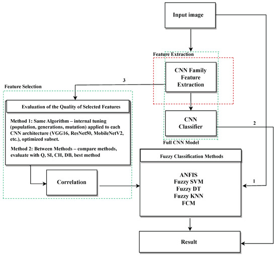 Table 1 summarizes the CNN architectures used in this work and the common classification head added to all of them. These deep features were then used as inputs to fuzzy logic-based classifiers, combining the automatic and powerful feature extraction capability of CNNs with the flexibility and uncertainty management provided by fuzzy models. This hybrid approach aims to improve diagnostic accuracy and robustness by leveraging the strengths of both methodologies.