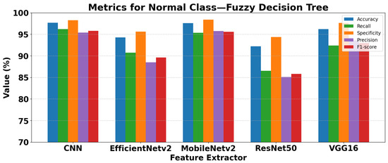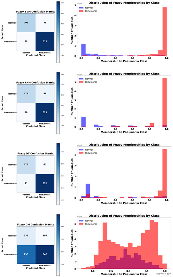 Among the fuzzy methods, Fuzzy KNN and Fuzzy SVM achieved the highest accuracy and F1-scores for both Normal and Pneumonia classes, demonstrating a balanced performance between precision and recall. Fuzzy Decision Tree also showed good performance, with the additional advantage of interpretability, which can be important in clinical settings. In contrast, Fuzzy C-Means showed lower reliability, particularly in correctly identifying healthy patients, due to sensitivity to feature quality and separability.