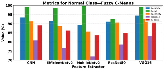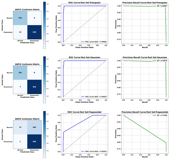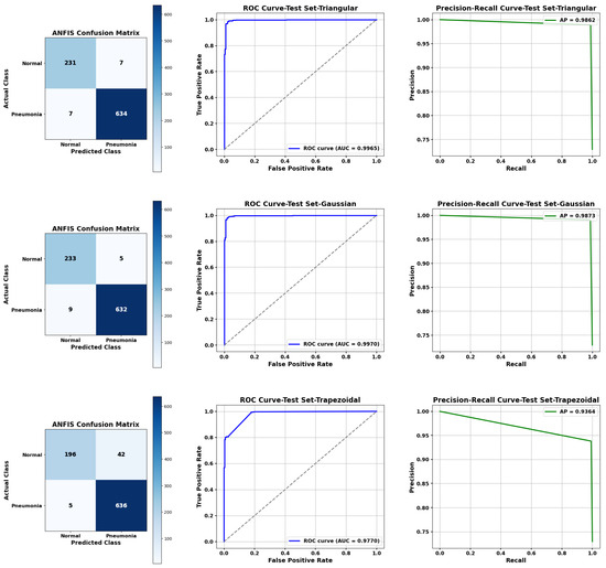 FCM shows the lowest performance among fuzzy methods, around 94.4% accuracy, with notable discrepancies between recall and precision for the Normal class, indicating difficulties in correctly identifying healthy patients. ANFIS demonstrates superior performance across both classes. Using MobileNetV2 features with Gaussian membership functions, ANFIS reaches 98.52% accuracy and F1-scores of 97.27% (Normal) and 98.99% (Pneumonia). ANFIS minimizes the gap between precision and recall for both classes, ensuring a balanced and clinically reliable classification.