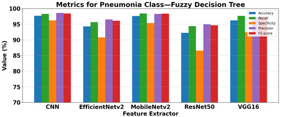 ANFIS consistently outperformed all traditional fuzzy classifiers. Using MobileNetV2 features with Gaussian membership functions, ANFIS achieved 98.52% accuracy and F1-scores of 97.27% (Normal) and 98.99% (Pneumonia), highlighting its ability to integrate CNN feature extraction with neuro-fuzzy reasoning for robust and stable classification. Moreover, ANFIS minimized the gap between precision and recall, a critical factor in clinical applications to reduce false negatives and ensure reliable diagnosis.