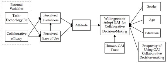 Building on the characteristics of human–GAI collaborative decision-making within the GAI context, this study extends the traditional TAM in several theoretical directions. First, it integrates the TTF model and innovatively introduces two external variables—task–technology fit and collaborative efficacy—to account for the dynamics of human–GAI collaborative decision-making [28]. Second, recognizing the critical role of trust in human–GAI interactions [29], the model incorporates human–GAI trust as a core construct. Additionally, the study controls for demographic and usage-related variables, including gender, age, education level, and frequency of engaging in GAI-supported collaborative decision-making. In summary, this study proposes a theoretical model that delineates the factors influencing users’ willingness to adopt GAI for collaborative decision-making in the context of GAI, as illustrated in Figure 1.