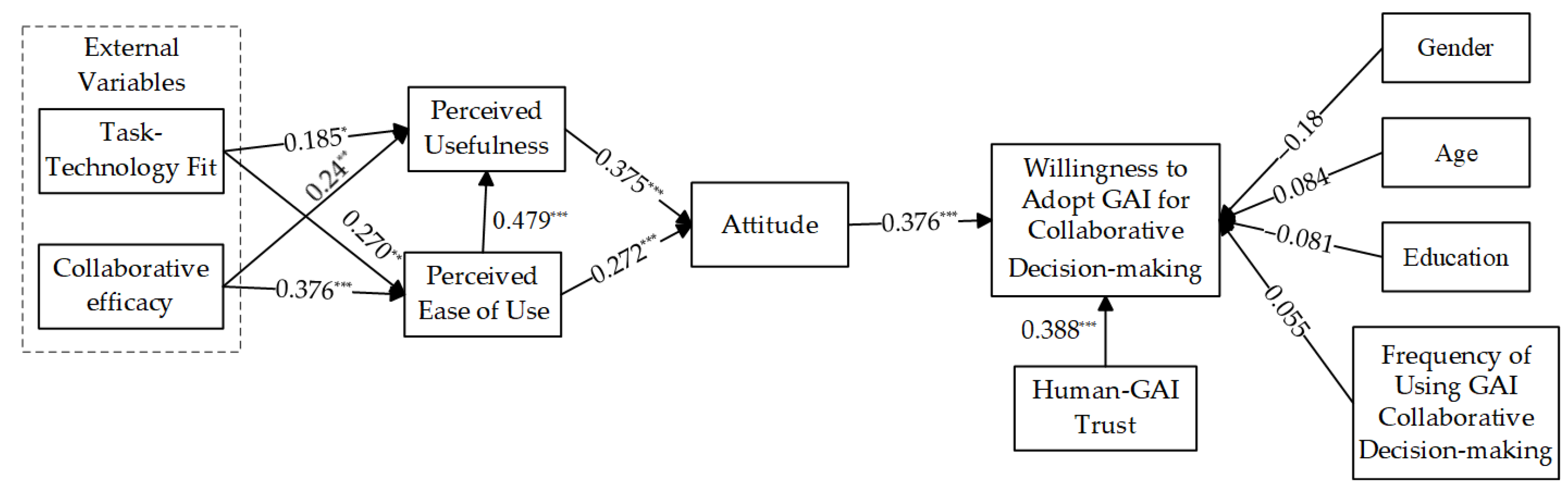 - The fsQCA results identified four high-willingness configuration pathways for adopting GAI in collaborative decision-making, which can be grouped into three categories. The cognitive value-driven pathway aligns with the theoretical model, emphasizing the role of collaborative efficacy in shaping users’ assessments of GAI’s usefulness in collaborative decision-making [48]. Users who developed positive cognitions regarding GAI’s practical value, collaborative efficacy, and attitudes toward its use exhibited significantly greater willingness to collaborate. The functional compensation-driven pathway demonstrates that the combination of external variables from the theoretical model—task–technology fit and collaborative efficacy—with perceived usefulness can compensate for users’ lack of human–GAI trust, leading decision-makers to accept collaboration primarily on functional grounds. This finding further confirms the central role of collaborative efficacy and perceived usefulness in shaping collaborative decision-making willingness. Finally, the trust in technology-driven pathway establishes a strong-drive configuration for collaborative decision-making willingness, grounded in perceived usefulness, perceived ease of use, and human–GAI trust, in combination with either task–technology fit or collaborative efficacy. Together, these pathways reveal that users may adopt preferences that are either task-oriented or outcome-oriented, depending on the decision-making context.