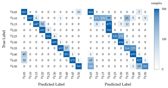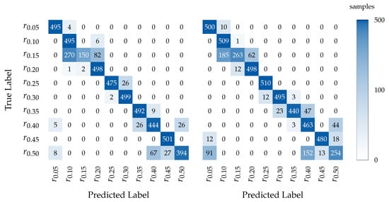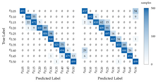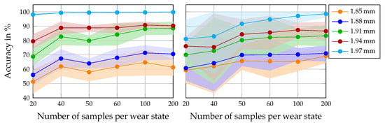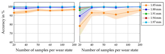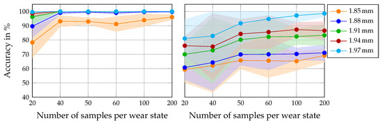 Figure 8 presents confusion matrices for both models trained on 40 samples per wear state and evaluated on 1.94 mm.