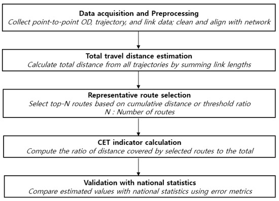 (Step 5) Output for CET Calculation: The final representative route set , obtained through this process is used as the input for CET calculation (Section 3.2) and subsequent VKT estimation.