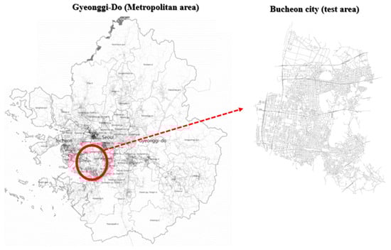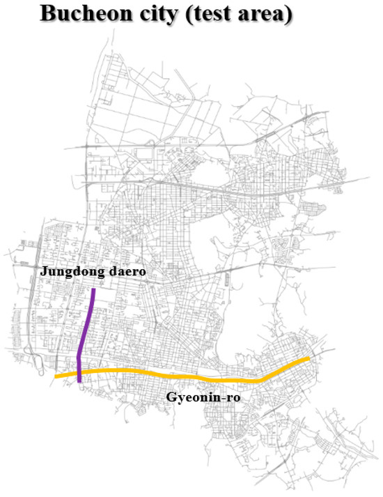 Bucheon, Gyeonggi Province, South Korea was selected as the study area to empirically evaluate the total VKT estimation and reliability assessment framework based on high-resolution vehicle trajectory data. As shown in Figure 2, Bucheon is a major hub situated between Seoul and Incheon. It experiences frequent intra-city and inter-regional travel, making it a critical transportation node. The well-developed road network of the city includes expressways, such as the Gyeongin Expressway and the Seoul Ring Expressway, along with primary and secondary arterial roads connecting the entire urban area. This functional road classification generates complex traffic patterns by blending long-distance inter-regional trips with short-distance intra-city movements. Consequently, the intricate road network of Bucheon provides an ideal testbed for evaluating the accuracy of the VKT estimation and the representativeness analysis of routes.