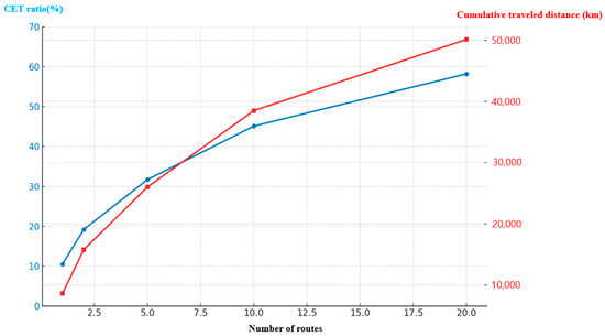Variation in CET with the number of representative routes.