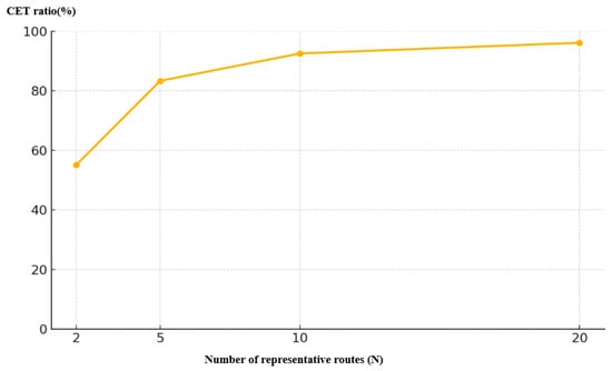 This section evaluated the explanatory power of the selected representative route set with respect to the CET metric and compared it with the cumulative VKT coverage described in Section 4.2. Cumulative VKT coverage represents the proportion of the total sampled trajectory distance captured by the representative routes. By contrast, CET measures the proportion of the total distance traveled along the representative routes in the statistical total VKT, which can be explained by the estimates derived from those routes. The CET ratio increases sharply as the number of representative routes (N) increases from 2 to 5, indicating the route-concentered nature of travel demand (Figure 5). The rate of increase tapers off above N = 5, suggesting diminishing returns in CET improvement as N increases. Notably, N = 5 yields a CET of 83.3%, even though the corresponding cumulative VKT coverage of sampled trajectories remain at 31.7% (Section 4.2). This contrast underscores that CET and cumulative VKT coverage, despite being related, represent distinct aspects of representativeness, each with its own denominator and interpretative implications.