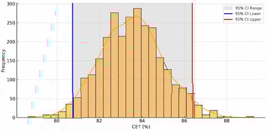 The bootstrap method was applied to assess the statistical stability of the CET metric, which measures the cumulative VKT ratio based on representative paths. A total of 1000 random resamples were drawn from the original dataset, and the CET values were recalculated for each resample. The CET values were consistently distributed within a 95% confidence interval (CI), ranging from 81.1% to 85.6% as depicted in Figure 9. The orange curve represents the kernel density estimation, providing a smooth approximation of the CET distribution. This finding suggests that the representative path set (N = 5) does not depend on any specific sample and possesses statistically robust explanatory power.