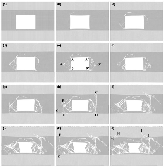 Following the excavation of a rectangular tunnel, stress concentration develops at the four corner points of the surrounding rock, where fractures initiation primarily occurs, as illustrated in Figure 2b–d. Subsequently, the fracture extends inward from these corner points along two sets of conjugate fracture planes—specifically OA and OB, as well as O′A′ and O′B′—located within the tunnel sidewalls, as shown in Figure 2e. Within the tunnel sidewalls, once the conjugate fracture surfaces intersect, further forward extension ceases, and vertical fracture initiate at the intersection points, extending downward to the floor, as depicted in Figure 2f,g. Upon reaching the floor, the failure process in the two sides diverges into two distinct modes: one involves upward extension from the intersection point toward the roof until the coal-rock interface is reached, resulting in a vertical fracture surface that penetrates the coal seam (e.g., CD in Figure 2h); the other involves continued inward extension, forming new conjugate fractures (e.g., EG and FG in Figure 2h), at the intersection of which a vertical fracture penetrating the coal seam is generated (e.g., HK in Figure 2k). Once a vertical fracture fully penetrates the coal seam from roof to floor, the failure continues to extend inward along the conjugate fractures, and upon intersecting with the roof, a new conjugate fractures extending upward is formed, as illustrated by MN and JI in Figure 2l.