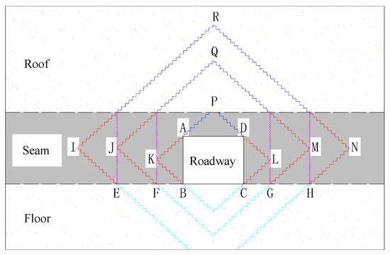 The simplified failure characteristics of the surrounding rock are presented in Figure 3, where line segments such as AK/BK and AP/DP represent conjugate fracture zones, while KF, LG, and MH indicate vertical fracture surfaces. It is evident that the development of fracture surfaces in the two sides and the roof exhibits a zonal failure pattern [10,11,12]. The formation of these conjugate fracture zones in both the sides and the roof arises from compressive and shear-induced failure mechanisms. Notably, when the horizontal stress in the floor reaches a critical level, a conjugate failure zone may also develop, thereby forming a closed fracture zone within the surrounding rock. The probability of such zonal failure increases with greater roadway burial depth. This phenomenon has been substantiated by previous research studies [12].