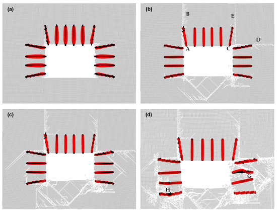 Figure 4 illustrates the development process of surrounding rock failure in the roadway under rock bolt reinforcement. The simulated rock bolts are 2.2 m in length and possess a bearing capacity of 100 kN. After reinforcement, failure initiation still occurs at the four corner points of the roadway (Figure 4a); however, the rock bolts effectively constrain failure extension along the conjugate failure surfaces commonly observed in unreinforced conditions (as shown in Figure 2e). Instead, the failure progresses along vertical or horizontal planes, as indicated by AB, CE, and CD in Figure 4b. A conjugate failure surface is also observed in the floor of the roadway (Figure 4b,c). When the roadway is subjected to mining-induced stress and an increase in roof pressure, failure initiates at the distal ends of the rock bolts (Figure 4c) and extends into the deeper surrounding rock in the form of conjugate failure surfaces (Figure 4d).