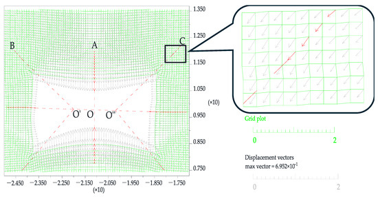 Following tunnel excavation, the deformation of the surrounding rock evolves as a progressive expansion from the surface toward deeper zones. Specifically, displacement initiates at the tunnel boundary and subsequently propagates from the near-field to the far-field regions of the surrounding rock mass. Analysis of the displacement vector distribution (Figure 5) reveals that the displacement direction at the tunnel surface is approximately perpendicular to the tunnel boundary. In contrast, the displacement vectors in deeper regions converge toward the tunnel center point “O,” as indicated by points O′ and O″ in Figure 5. Furthermore, the alignment of displacement vectors with point O becomes more pronounced with increasing depth. This pattern suggests that the deformation of shallow surrounding rock is strongly influenced by the tunnel geometry, while the deep surrounding rock exhibits deformation behavior that is relatively independent of the tunnel shape. If the direction of the displacement vector is interpreted as the direction of surrounding rock convergence toward the tunnel, as exemplified by AO, BO′, and CO″ in Figure 5, the magnitude of convergence displacement is significantly greater in the shallow surrounding rock than in the deeper zones.