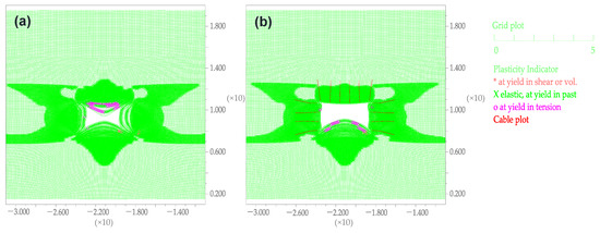 A comparative analysis of Figure 2 and Figure 4 reveals that rock bolt support effectively restricts the development of shear failure in the shallow surrounding rock adjacent to the roadway. However, under elevated stress conditions, the support system is limited in its ability to prevent the initiation and extension of failure beyond the anchoring zone. In unsupported scenarios, surrounding rock failure predominantly occurs in the roof and both sides of the roadway. Following rock bolt reinforcement of these regions, the floor emerges as the primary zone of failure concentration. Shear failure extends from the floor toward both sides, resulting in the crushing of surrounding rock at the base of the sidewalls, thereby reducing the effectiveness of the rock bolt support system. The four corners of the roadway constitute key control points for rock bolt reinforcement. To improve support effectiveness, the inclination angle of the rock bolts should be increased—specifically, the side bolts at the corners should be oriented toward the roof and floor, while the roof bolts should be inclined outward. Furthermore, the length and shear resistance capacity of rock bolts at these critical locations should be enhanced. In roadways characterized by weak floor strata, floor heave has become a major challenge in the control of mining-induced roadway deformation [14].