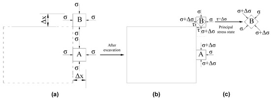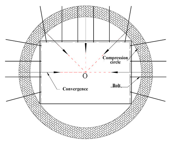 In the analysis of the mechanism of arching guided by rock bolts, the horizontal and vertical in situ stresses in the region to be excavated are also assumed to be equal atσ. Figure 9a presents the stresses in the surrounding rock before excavation. Element A is a square element with an edge length of dx located at a surface of the roadway, and its position is expressed in orthogonal coordinates. The principal stresses across its edges are equal at σ, as shown in Figure 9a. Element B is located in the anchorage zone. For ease of analysis, its position is expressed in polar coordinates, with the origin located at the center of the roadway. Let x be the distance from element B to the origin, dθ be the corresponding central angle, and dx denote its radial length. Before excavation, the principal stresses at its four edges are equal at σ (Figure 9a). It is clear that both elements A and B are in equilibrium before excavation, because the net force on each of them is zero. Let dx be the distance between the farthermost point affected by excavation and the roadway surface. The upper diagram in Figure 9b illustrates the stress states of elements A and B after excavation in the case where the roadway is unsupported. In this case, element A is subjected to a net force greater than zero and tends to move towards the interior of the roadway, while element B is still in equilibrium. The lower diagram in Figure 9b shows their stress states when the roadway is supported with rock bolts. In this case, element A tends to move towards the inside of the roadway. Meanwhile, the traction force at the rock-bolt surface arising from its motion will drag element B towards the inside of the roadway. In the radial direction, element B and the two neighbors on its left and right sides tend to move in the same direction. The analysis above suggests that near-surface elements have greater displacements than distant ones. The stresses at the left and right edges of element B then decrease to σ − Δσ″ and σ − Δσ‴, respectively, and Δσ″ ≥ Δσ‴. In the circumferential direction, element B and its two neighbors will undergo compression as they converge towards the roadway. Let Δσ’ denote the resulting increase in each circumferential stress. Then the total circumferential force acting on element B is 0, while the total radial force is (Δσ′ + Δσ‴) dθdr + (Δσ‴ − Δσ″) rdθ, where r is the distance from element B to point O. In effect, this radial force is the reaction force that balances the tensile force exerted on the bolt by the surrounding rock. It helps stabilize element A by resisting its convergence. Element B, together with other elements at similar depths, will constitute a compressive arch (circle) (Figure 7). This compressive arch (circle) can not only maintain its own stability, but also can prevent further deformation and failure of near-surface rocks and support the rock outside the anchorage zone.