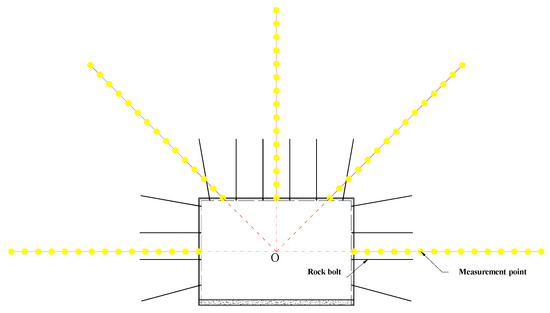 In the numerical simulation, displacement and stress in the surrounding rock were measured at points arranged at intervals of 0.5 cm along five observation lines. The observation lines lie on five rays sharing an endpoint at the center of the roadway, as shown in Figure 10. Then the patterns of variation in displacement and stress in the surrounding rock were analyzed to reveal the effects of near-surface rocks on distant rocks after rock bolting.