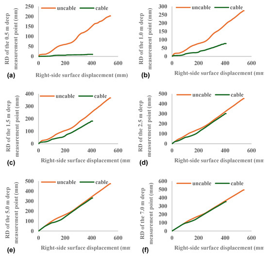 Variation in RD of internal measurement points with right-side surface displacement. Note: (a) shows the variation in RD of the 0.5 m deep measurement point; (b) shows the variation in RD of the 1.0 m deep measurement point; (c) shows the variation in RD of the 1.5 m deep measurement point; (d) shows the variation in RD of the 2.5 m deep measurement point; (e) shows the variation in RD of the 5.0 m deep measurement point; (f) shows the variation in RD of the 7.0 m deep measurement point.