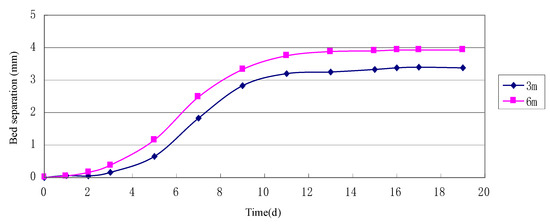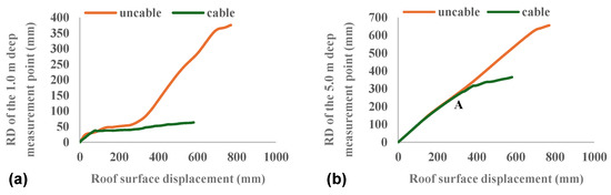 A comparison of Figure 11 with Figure 12 shows that the RD of measurement points in the roof varies with roof surface displacement in a similar manner to the RD of those in the side. As roof subsidence is also affected by gravity. While the distant rock in the roof stays stable due to the support from the compressive arch around the bolt-supported roadway or the arch of natural equilibrium around the unsupported roadway, the near-surface rock tends to subside under gravity and then separates from the distant rock. Meanwhile, as the floor becomes less stable (Figure 6), the distant rock undergoes overall subsidence due to gravity. For a given roof surface displacement, the RD of internal measurement points are smaller in the case of bolt supported roadway than in other cases, because the rock bolts can reduce the separation between near-surface rock and distant rock. This is manifested by the divergence of the two curves after point A shown in Figure 12b.