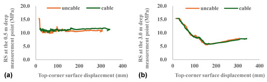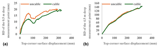 Similar patterns can be observed in the RD curves for the measurement points along a diagonal measurement line (Figure 13). Figure 13a demonstrates that the differences between the RD of near-surface rocks in the two cases are not significant. For example, at a top-corner surface displacement of 100 mm, the RD of the 0.5 m deep measurement point in the case of the rock-supported roadway is 9.1 mm, which is close to that in the other case, at 12.8 mm. After stabilization, the maximum RD in the two cases is 19.1 mm and 19.8 mm, respectively. This is because the surrounding rock along this measurement line is in mechanical equilibrium (Figure 8) and thus able to maintain stability. The convergence of corner-surface rocks is driven primarily by the compressive force exerted by the distant rocks, which arises from the deformation of distant rocks due to stress concentration. This explains why the RD of distant rocks is small even in the absence of rock bolts.