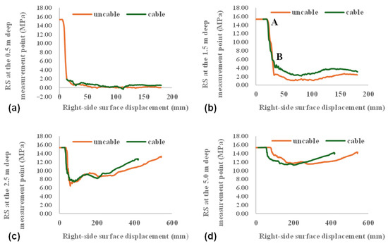 Figure 14 and Figure 15 illustrate the relationship of side surface displacement to the radial stress (RS) and circumferential stress (CS), respectively, at the measurement points. The Figures reveal that as the surface displacement increases, both the RS and CS in the anchorage zone tend to be stable after a sharp decline. During the stage of stress decline, the anchorage zone undergoes more rapid stress decline than the corresponding region around the unsupported roadway. For example, when the side surface displacement is 27.5 mm, the RS at the 1.5 m deep measurement point is 7.64 MPa in the case of bolt-supported roadway and 9.42 MPa in the case of unsupported roadway (Figure 14b), and the corresponding CS is 16.9 MPa and 18.0 MPa, respectively (Figure 15b). After the surrounding rock reaches equilibrium, the RS and CS in the anchorage zone are higher than those in the corresponding region in the case of unsupported roadway. In the presence of rock bolts, the RS at the measurement points 0.5 m and 1.5 m from the surface are 0.5 MPa and 3.5 MPa, respectively, and the CS there are 11.0 MPa and 16.0 MPa, respectively. In the absence of rock bolts, the RS at the 0.5 m and 1.5 m deep measurement points are subjected to RS of 0.1 MPa and 2.2 MPa, respectively, and the corresponding CS are 10.0 MPa and 13.5 MPa. Outside the anchorage zone, the RS decreases and then increases with increasing surface displacement. After the roadway reaches a stable state, it tends to stabilize at a level lower than its original level (Figure 14c,d). The CS tends to rise after a slight drop and then stabilizes at a level greater than the original level (Figure 15c,d). It follows that in the early deformation stage, the rock bolts can accelerate the stress decline within the anchorage zone and increase the residual strength of the rock therein [16]. According to the analysis of stress state (Figure 9), in the presence of rock bolts, the surface deformation can lead to a RS decrease and a CS increase in the distant rocks in this stage. As the surrounding rock reaches a state of limit equilibrium as shown in Figure 6 [17], these stress variations will cause the rock to deform plastically, thus reducing its bearing capacity. This can in turn lower the level of CS.