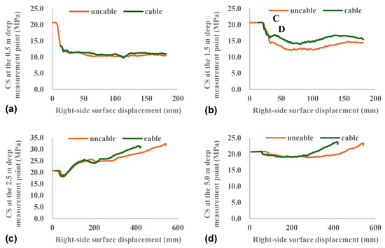 Variation in CS of internal measurement points with right-side surface displacement. Note: (a) shows the variation in CS of the 0.5 m deep measurement point; (b) shows the variation in CS of the 1.5 m deep measurement point; (c) shows the variation in CS of the 2.5 m deep measurement point; (d) shows the variation in CS of the 5.0 m deep measurement point.