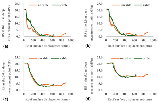 Variation in RS of internal measurement points with roof surface displacement. Note: (a) shows the variation in RS of the 1.5 m deep measurement point; (b) shows the variation in RS of the 2.0 m deep measurement point; (c) shows the variation in RS of the 3.0 m deep measurement point; (d) shows the variation in RS of the 5.0 m deep measurement point.